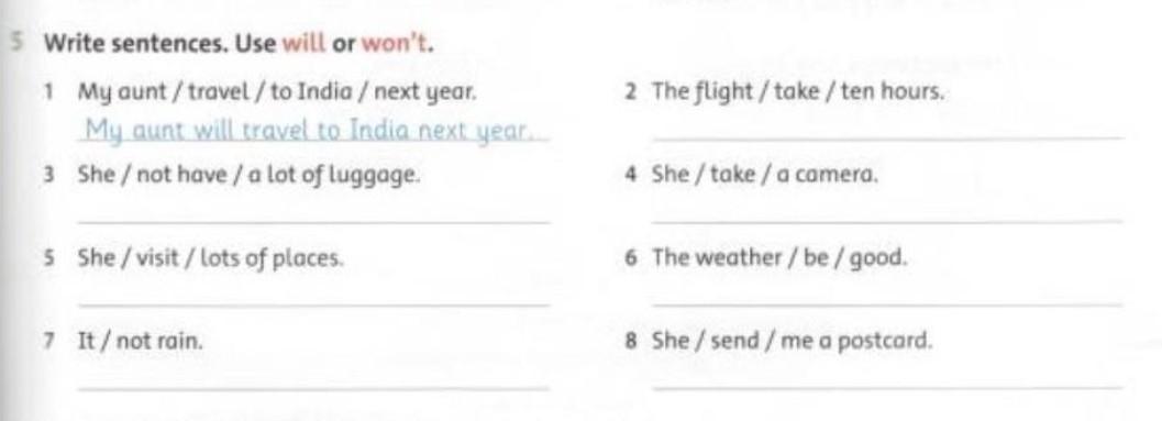Write sentences. Use will or won't. 1 My aunt/travel/to India / next year. My aunt will travel to India next year. 3 She/not have a lot of luggage. 5 She/visit/lots of places. 7 It/not rain. 2 The flight/take/ ten hours. 4 She/take/a camera. 6 The weather/be/good. 8 She/send/me a postcard.