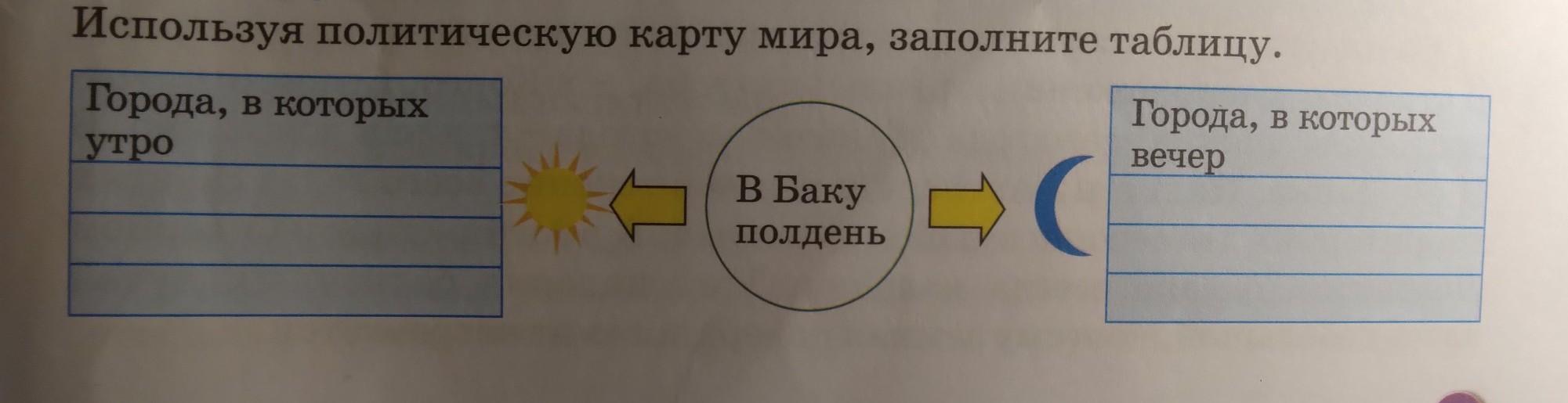 Уточнение: Конечно, эти города находятся в разных часовых поясах, и время суток может быть разным, но если предположить, что все эти города находятся в своих стандартных часовых поясах, то это будут города, где утро или вечер, когда в Баку полдень.
