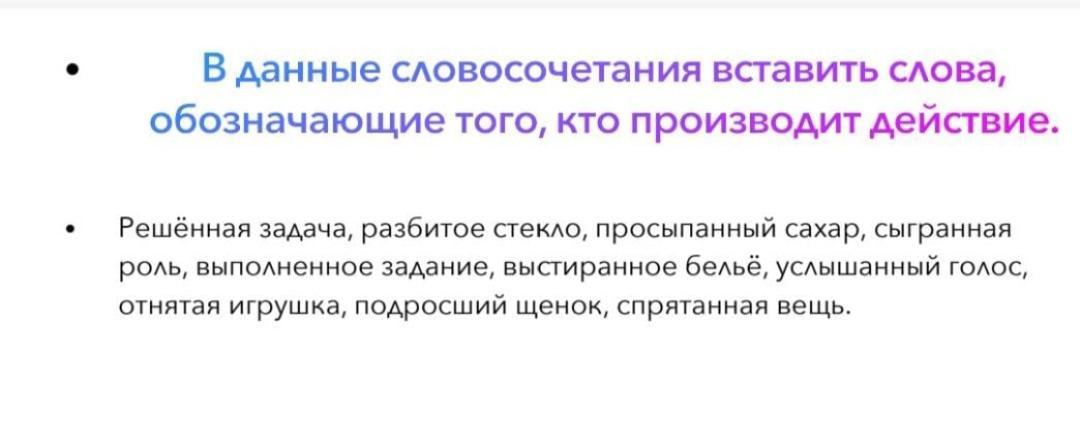 В данные словосочетания вставить слова, означающие того, кто производит действие.