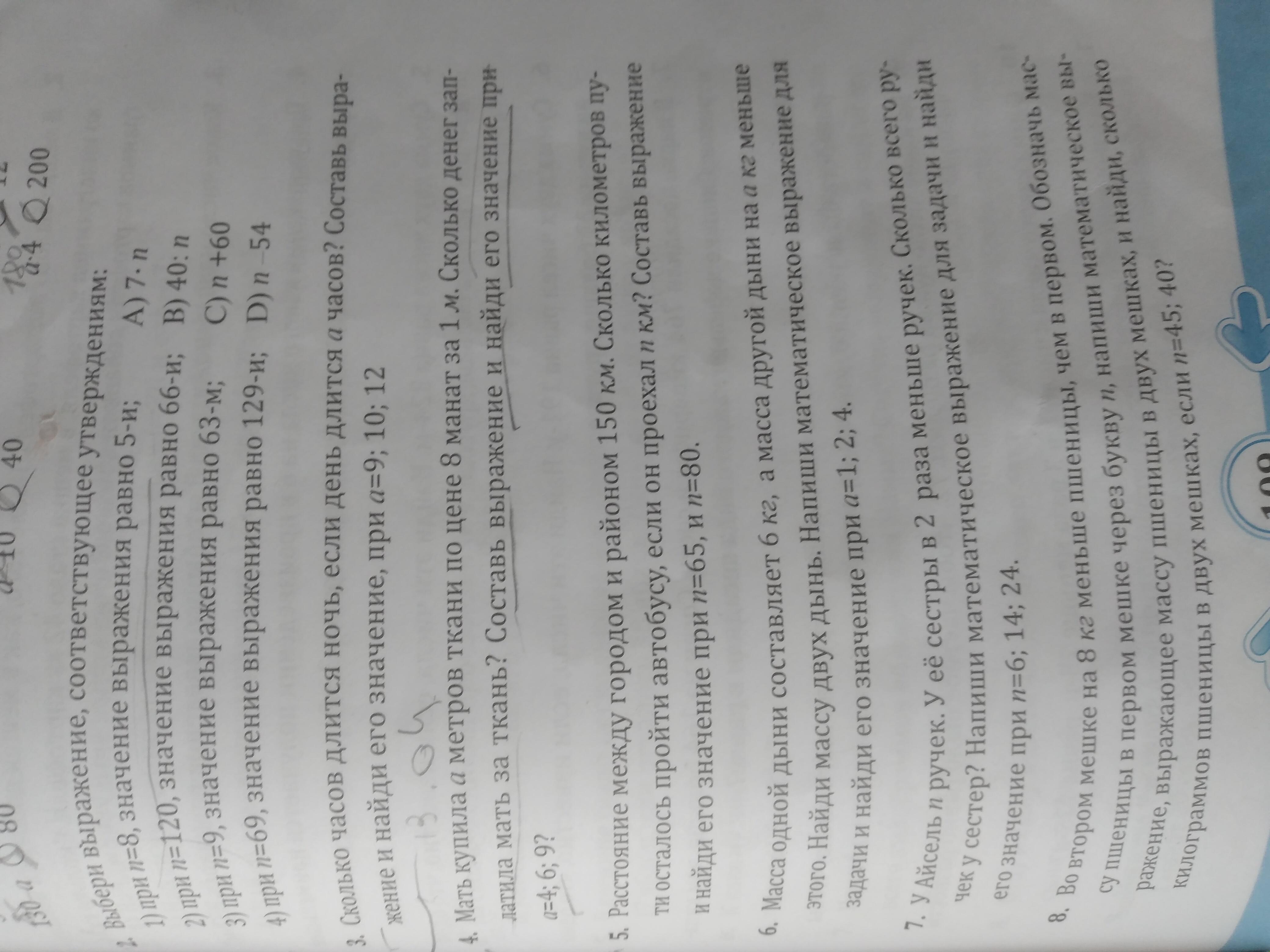 Мать купила а метров ткани по цене 8 манат за 1 м . Сколько денег заплатила мать за ткань ? Составь выражение и найди его значение при а =4;6;9
