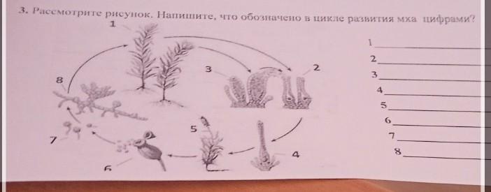 3. Рассмотрите рисунок. Напишите, что обозначено в цикле развития мха цифрами? 1 2 3 4 5 6 7 8
