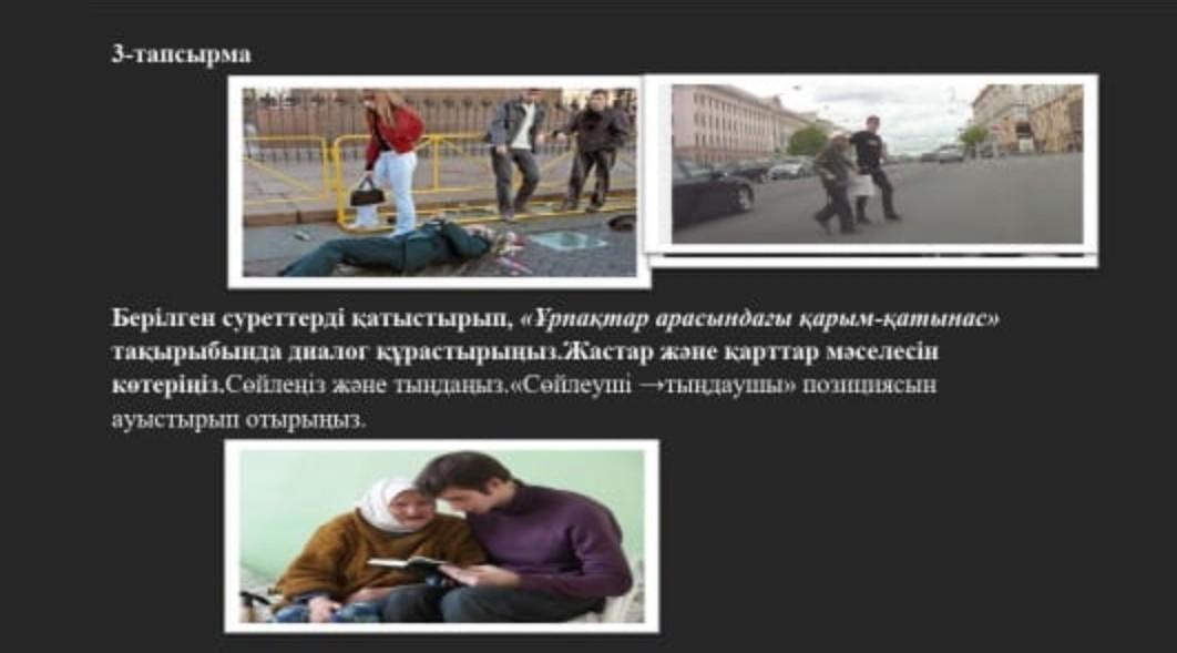 3-тапсырма Берілген суреттерді қатыстырып, «Ұрпақтар арасындағы қарым-қатынасм такырыбында диалог курастырыныз. Жастар және карттар мәселесін көтерініз.Сейленіз және тынданыз. Сейлеушi-тындаушы» позициясын ауыстырып отырыныз.