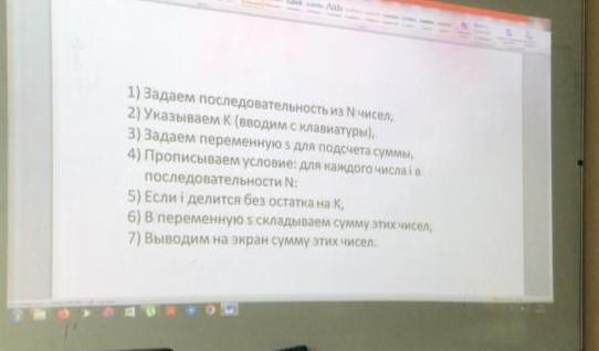 1) Задаем последовательность из N чисел, 2) Указываем к (вводим с клавиатуры). 3) Задаем переменную с для подсчета суммы, 4) Прописываем условие: для каждого числа i п последовательности N 5) Если i делится без остатка на к 6) в переменную з складываем сумму этих чисел, 7) Выводим на экран сумму этих чисел.