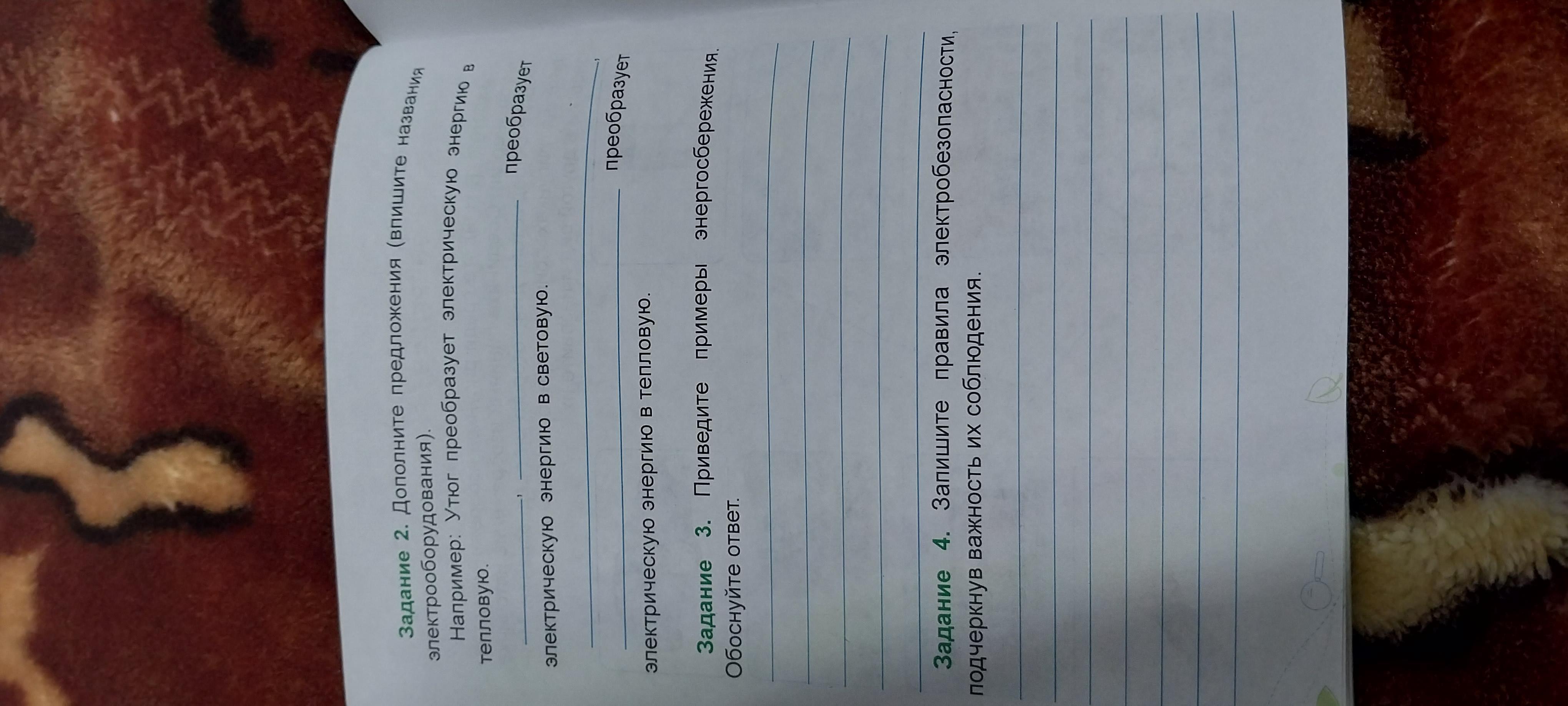 следущия страница задание 2 Лампа, телевизор преобразует электрическую энергию в световую.Тепловые батареи преобразуют электрическую энергию света. задание 3.Нужно беречь свет ни то погибнет вся страна. задание 4 Нельзя прикасаться маленьким к розетке. Нельзя брать электрические приборы детям.
