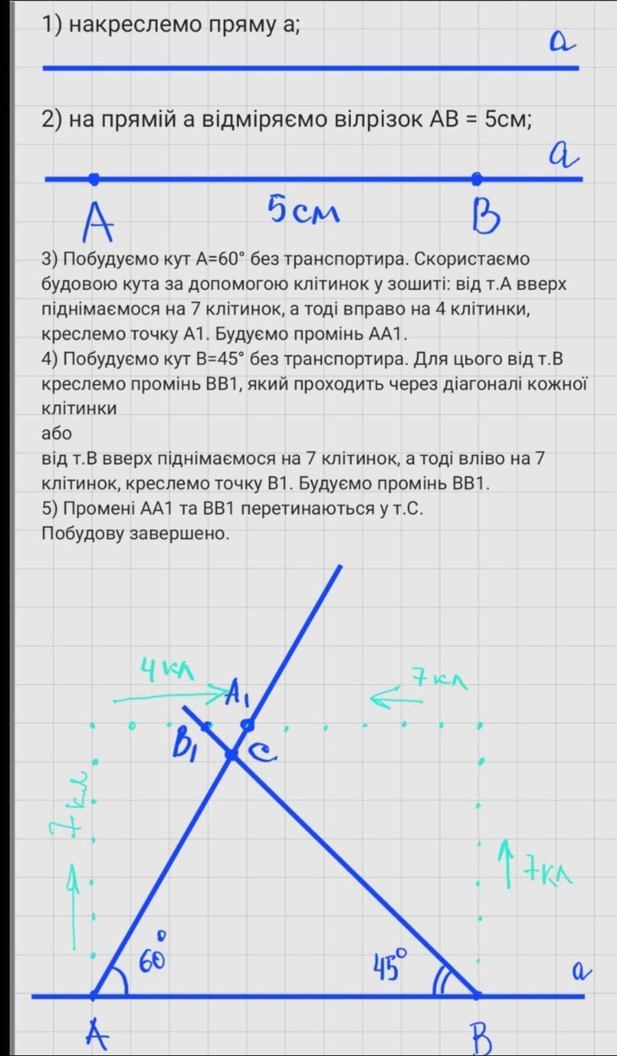 На фото пропоную побудову задачі по клітинкам зошита. А якщо треба було побудувати за допомогою лінійки та циркуля, то це зовсім інше креслення