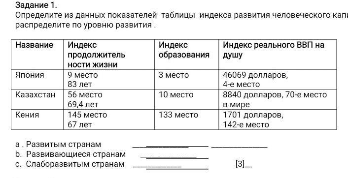 Определите из данных показателей таблицы индекса развития человеческого капитала и распределите по уровню развития .