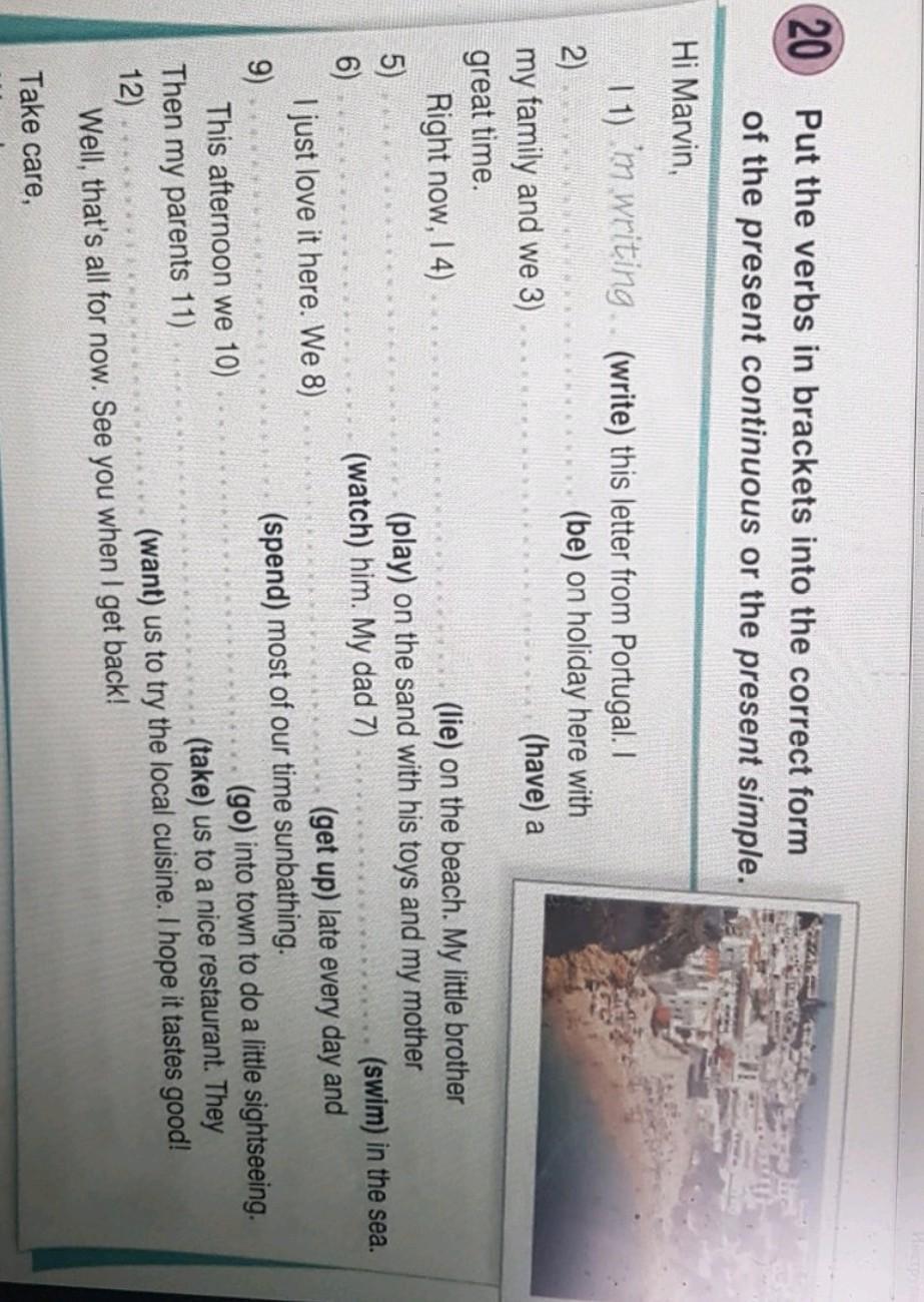 20 Put the verbs in brackets into the correct form of the present continuous or the present simple. Hi Marvin, 11) 'm writing.. (write) this letter from Portugal. I (be) on holiday here with (have) a 2) my family and we 3) great time. Right now, I 4) 5) 6) 9) HINS ***** ***** I just love it here. We 8) This afternoon we 10) Then my parents 11) 12) Take care, Wendy (lie) on the beach. My little brother (play) on the sand with his toys and my mother (watch) him. My dad 7) (spend) most of our time sunbathing. Well, that's all for now. See you when I get back! (swim) in the sea. (get up) late every day and (go) into town to do a little sightseeing. (take) us to a nice restaurant. They (want) us to try the local cuisine. I hope it tastes good! СРОЧНО ООО ДАЮ 50 БАЛІВ!!!!!!!!!!!!!!!