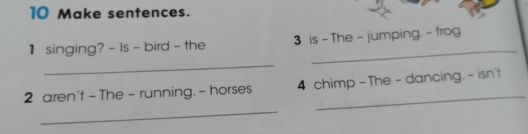 10 Make sentences. 1 singing? - Is - bird - the 2 aren't -The- running. - horses 3 is - The - jumping. - frog 4 chimp - The - dancing. - isn't Нужно составить приложение ДАЮ 20 БАЛОВ ПОМООГИТЕ