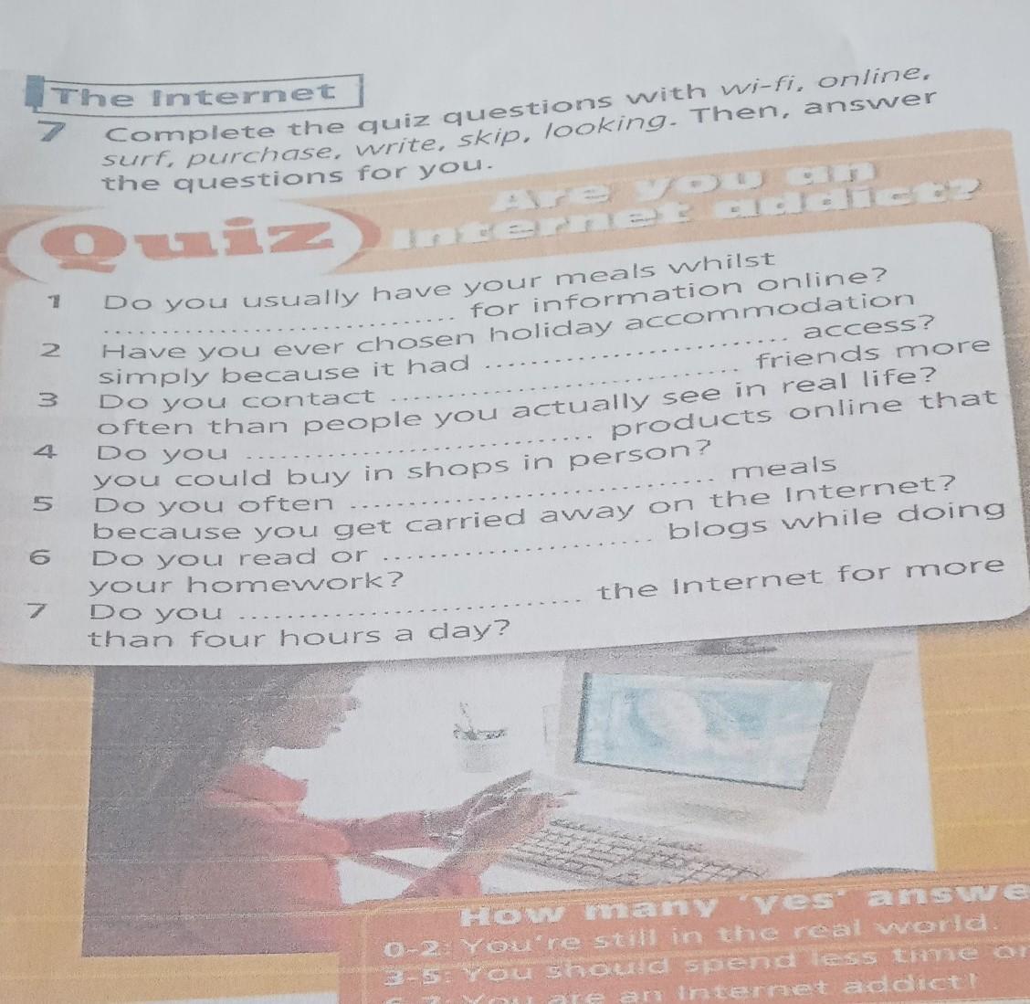 Complete the quiz questions with wi-fi, online, surf, purchase, write, skip, looking. Then, answer the questions for you.