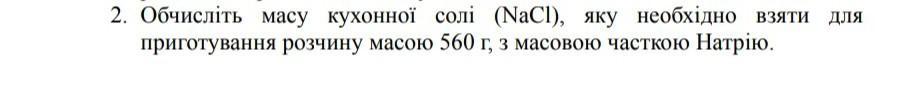 2. Обчисліть масу кухонної солі (NaCl), яку необхідно взяти ДЛЯ приготування розчину масою 560 г, з масовою часткою Натрію.