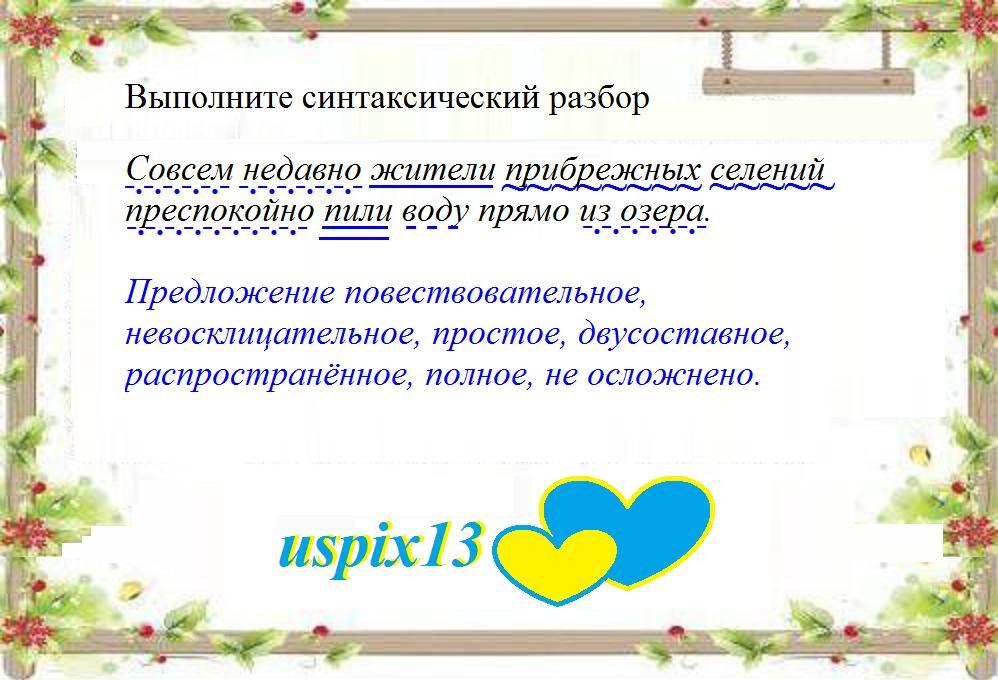 выполните синтаксический разбор совсем недавно жители прибрежных селений преспокойно пили воду прямо из озера