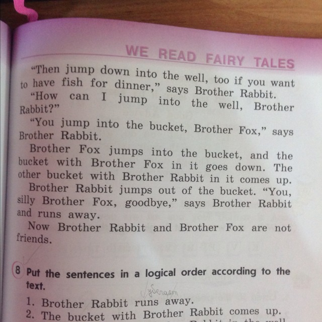 Братец лис прыгнул в ведро и ведро с братцем лисом упало вниз другое ведро с братцем кроликом поднялось наверх "ты глупый прощай" сказал братец кролик и убежал