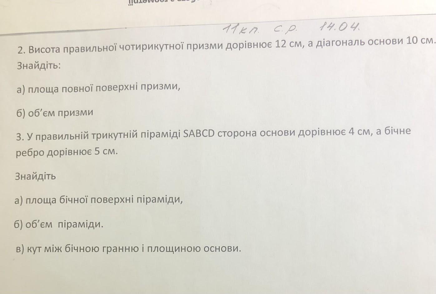2) а)площа повноï поверхнi призми. 3) в) кут мiж бiчною гранню i площиною основи
