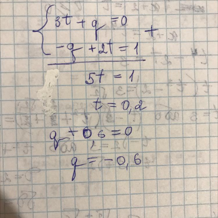 Розв'язати систему рівнянь методом алгебраїчного додавання: {3t+q=0,−q+2t=1