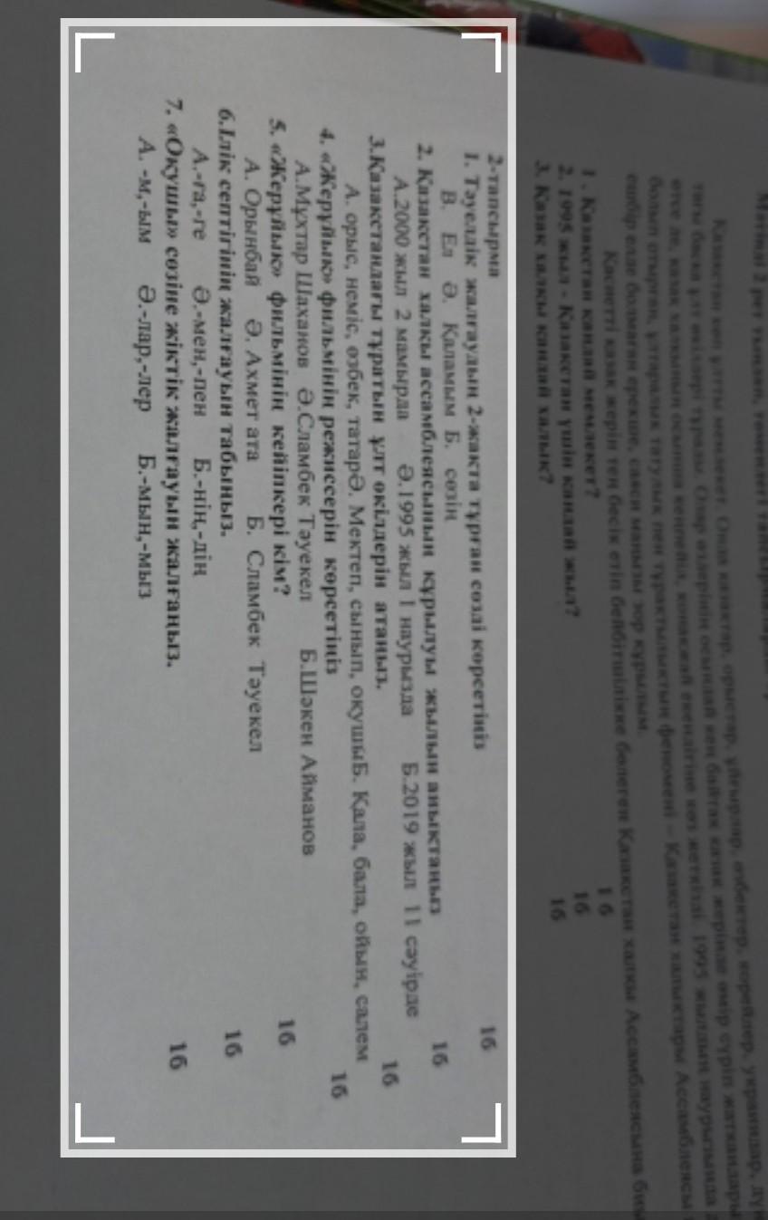 2-тапсырма 1. Тәуелдік жалғаудын 2-жакта тұрған сөзді көрсетіңіз В. Ел Ә. Каламым Б. сөзің 2. Қазақстан халқы ассамблеясынын кұрылуы жылын аныктаныз Ә.1995 жыл 1 наурызда А.2000 жыл 2 мамырда 3.Казакстандағы тұратын ұлт өкiлдерiн атаныз. А. орыс, неміс, өзбек, татарӘ. Мектеп, сынып, окушыБ. Кала, бала, ойын, салем 4. «Жерұйық» фильмiнiн режиссерін көрсетіңіз А.Мұхтар Шаханов Ә.Сламбек Тәуекел 5. «Жерұйық» фильмiнiн кейiпкерi кiм? А. Орынбай Ә. Ахмет ата Б. Сламбек Тәуекел Б.Шәкен Айманов 6. Ілік септігінің жалғауын табыңыз. А.-га,-ге Ә.-мен,-пен Б.-НiҢ,-дiң 7. «Окушы» сөзіне жіктік жалғауын жалғаңыз. А. -м,-ым Ә.-лар,-лер Б.-мын,-мыз Б.2019 жыл 11 сәуірде 16 16 16 16 16 16 16
