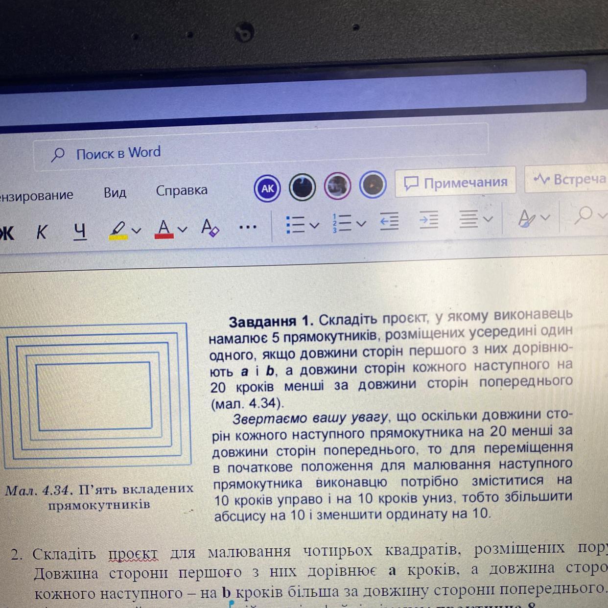 Завдання 1. Складіть проект, у якому виконавець намалює 5 прямокутників, розміщених усередині один одного, якщо довжини сторін першого з них дорівню- ють а ір, а довжини сторін кажного наступного на 20 кроків менш за довжини сторін