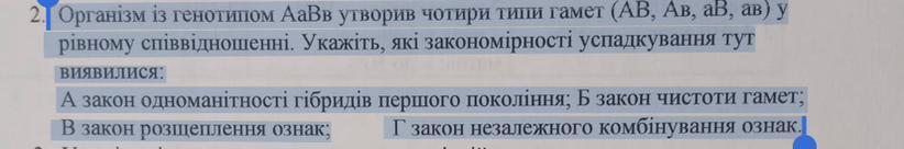 Організм із генотипом ДаВв утворив чотири типи гамет (AB, Ав, аВ, ав) у рівному співвідношенні. Укажіть, які закономірності успадкування тут