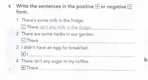 c Write the sentences in the positive or negative form. 1 There's some milk in the fridge. There isn't any milk in the fridge. 2 There are some herbs in our garden. There 3 I didn't have an egg for breakfast. 4 There isn't any sugar in my coffee. +There