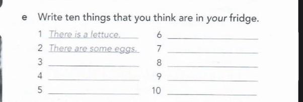 Write ten things that you think are in your fridge. 1 There is a lettuce. 6 2 There are some eggs. 7 3 8 4 9 5 10