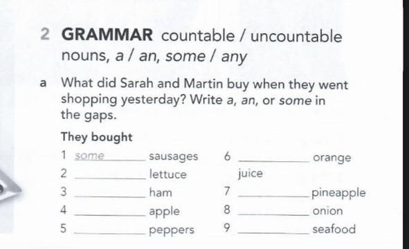 2 GRAMMAR countable / uncountable nouns, a / an, some / any a What did Sarah and Martin buy when they went shopping yesterday? Write a, an, or some in the gaps. They bought 1 some 2 3 345 4 5 sausages lettuce ham apple peppers 6 7 8 9 juice orange pineapple onion seafood