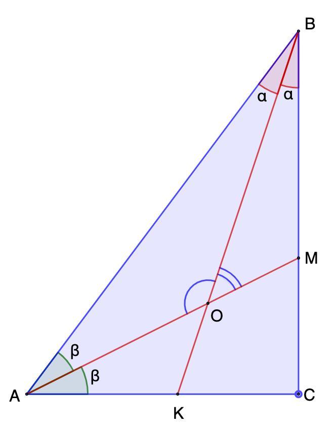 Пусть ∠АВК = ∠КВС = α; ∠ВАМ = ∠МАС = β