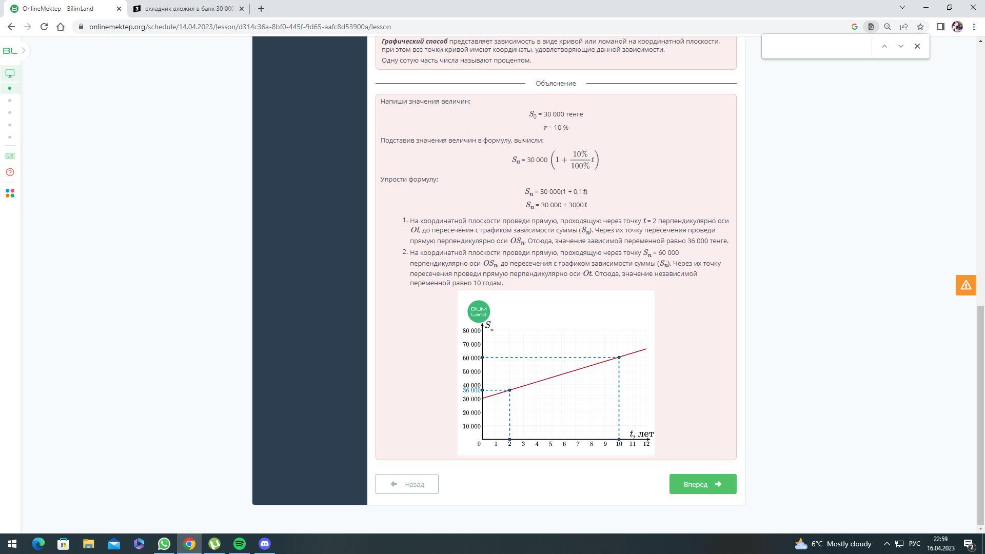 вкладчик вложил в банк 30 000 тенге,если процентная ставка составит 10% и формула простых процентов Sn=S0(1+r:100%*t),где Sn - будущая сумма ,S0-текущая сумма,r-ставка простых процентов ,t - количество лет,то запиши формулу зависимости суммы (Sn) вкладчика от времени(t).Даю 20 баллов,помогите пж