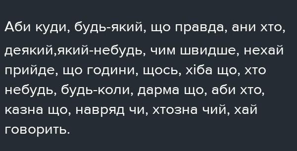 Аби куди, будь-який, що правда, ани хто, деякий,який-небудь, чим швидше, нехай прийде, що години, щось, хіба що, хто небудь, будь-коли, дарма що, аби хто, казна що, навряд чи, хтозна чий, хай говорить.