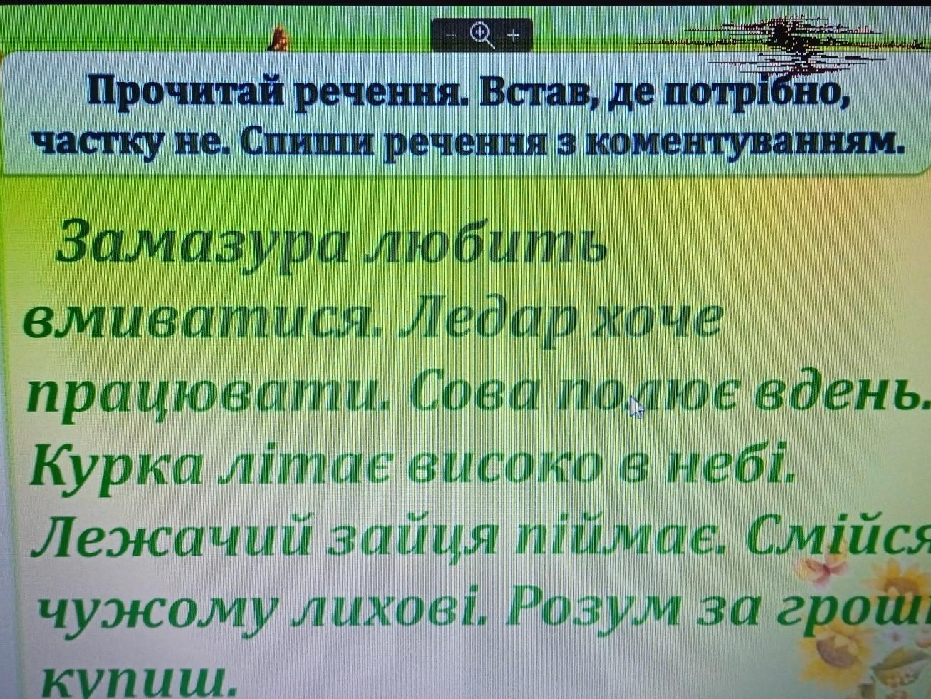 Прочитай речення. Встав, де потрібно, частку не. Спиши речення з коментуванням. To Замазура любить вмиватися. Ледар хоче працювати. Сова полює вдень. Курка літає високо в небі. Лежачий зайця піймає. Смійся чужому лихові. Розум за гроші купиш.