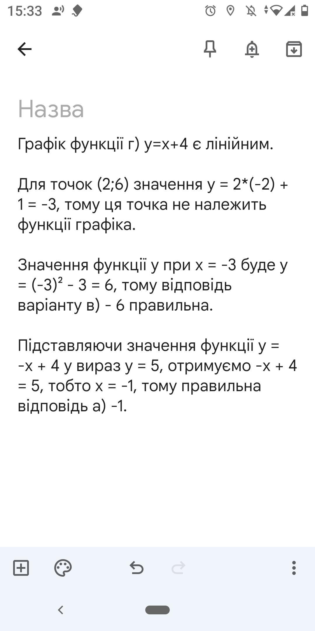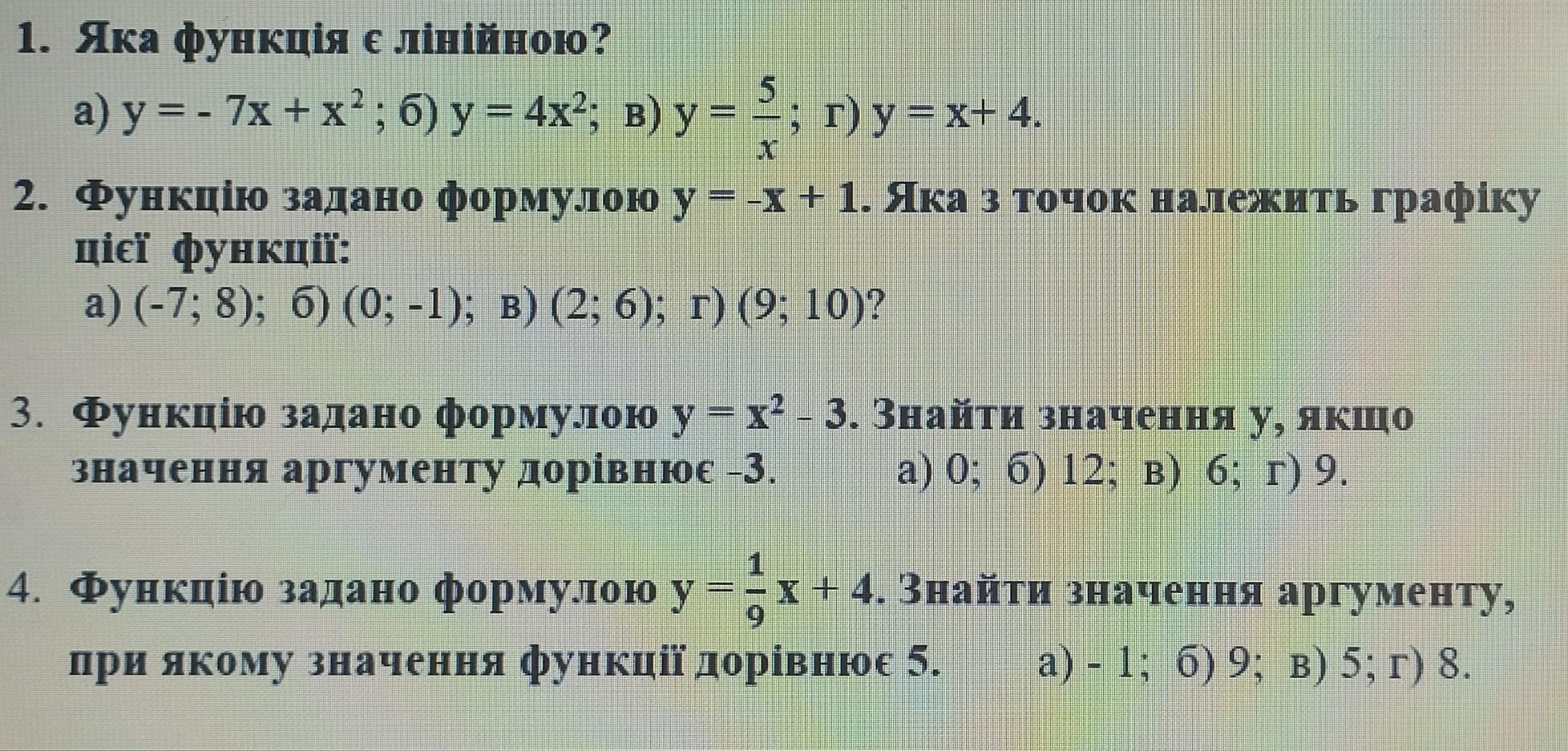 на прави a) y правильна 1. Яка функція є лiнiйною? = = - 7x + x² ; б) y =4x²; в) y=³; г)y=x+4. 2. Функцiю задано формулою у=-x+1. Яка з точок належить графіку цієї функції: a) (-7; 8); 6) (0; -1); в) (2; 6); г) (9; 10)? 3. Функцiю задано формулою у = х² - 3. Знайти значення у, якщо значення аргументу дорівнює -3. a) 0; б) 12; в) 6; г) 9. 4. Функцію задано формулою у = - х + 4. Знайти значення аргументу, при якому значення функції дорівнює 5. a) - 1; б) 9; в) 5; г) 8.
