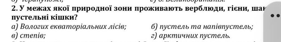 2. У межах якої природної зони проживають верблюди, гієни, шаг пустельні кішки? а) Вологих екваторіальних лісів; б) пустель та напівпустель; г) арктичних пустель.