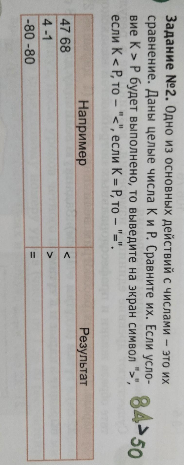 Задание №2. Одно из основных действий с числами это из сравнение. Даны целые числа К и Р. Сравните их. Если условие К>Р будет выполнено, то выведите на экран символ ">", если К < Р, то - "=", если К