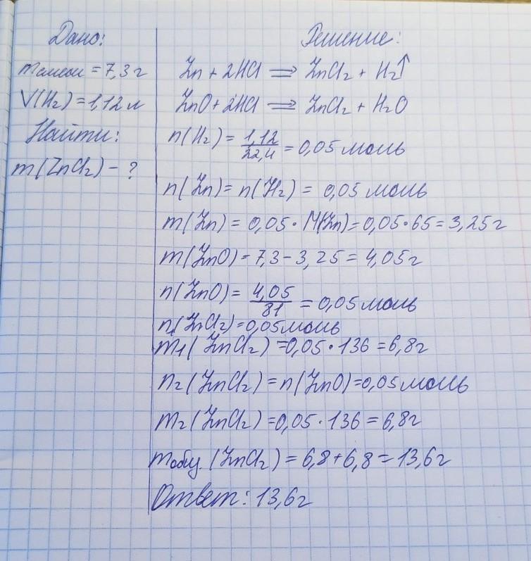 У результаті взаємодії 7,3 г суміші цинку (Zn) і цинк оксиду (ZnO) з надлишком хлоридної кислоти (HCI) виділилося
