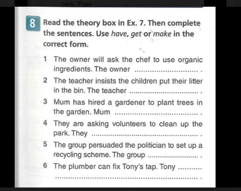 5. The group persuaded the politician to set up a recycling scheme. The group got the politician to set up a recycling scheme.