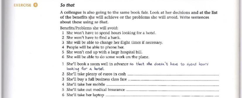 A colleague is also going to the same book fair. Look at her decisions and at the list of the benefits she will achieve or the problems she will avoid. Write sentences about these using so that.