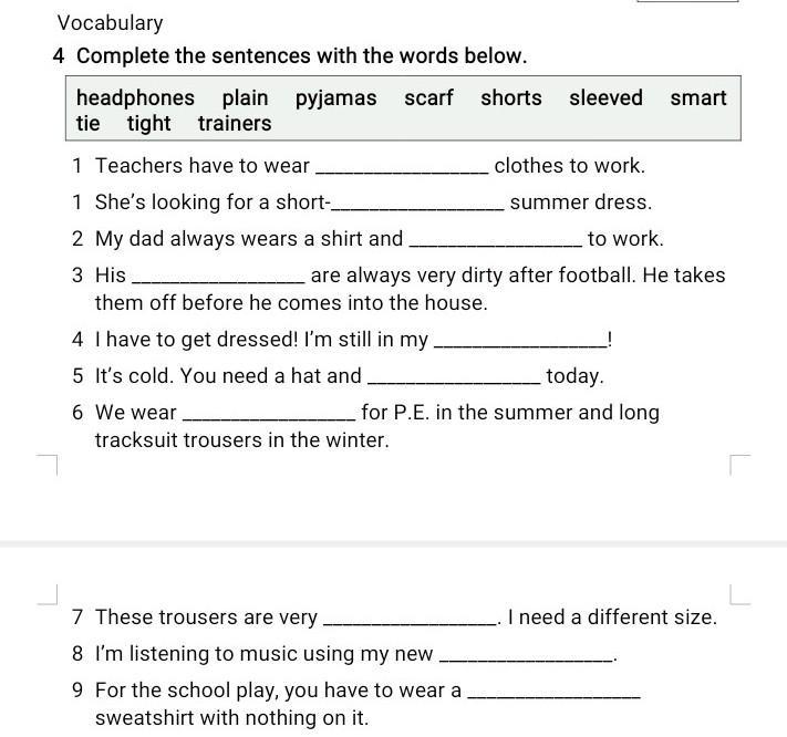 4 Complete the sentences with the words below. scarf scarf shorts sleeved smart headphones plain pyjamas tie tight trainers 1 Teachers have to wear. 1 She's looking for a short- 2 My dad always wears a shirt and. to work. 3 His are always very dirty after football. He takes them off before he comes into the house. 4 I have to get dressed! I'm still in my 5 It's cold. You need a hat and. clothes to work. summer dress. today. for P.E. in the summer and long 6 We wear tracksuit trousers in the winter. 7 These trousers are very. 8 I'm listening to music using my new 9 For the school play, you have to wear a sweatshirt with nothing on it. I need a different size.