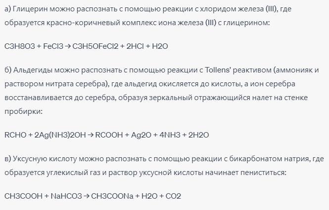 9. С помощью каких реактивов распознать: а) глицерин; б) альдегид; в) уксусную