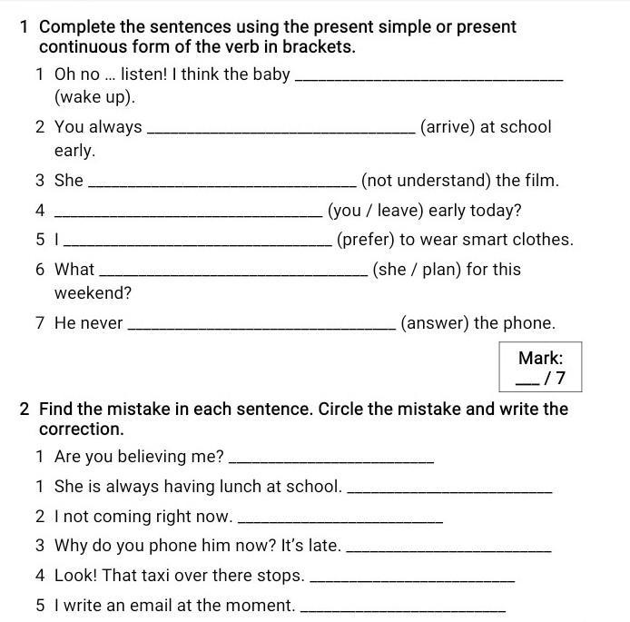 1 Complete the sentences using the present simple or present continuous form of the verb in brackets. 1 Oh no... listen! I think the baby. (wake up). 2 You always early. 3 She 4 51 6 What weekend? 7 He never (arrive) at school .(not understand) the film. (you leave) early today? (prefer) to wear smart clothes. (she plan) for this 1 Are you believing me? 1 She is always having lunch at school. 2 I not coming right now.. 3 Why do you phone him now? It's late. 4 Look! That taxi over there stops. 5 I write an email at the moment. (answer) the phone. Mark: - 17 2 Find the mistake in each sentence. Circle the mistake and write the correction. Mark: __/6