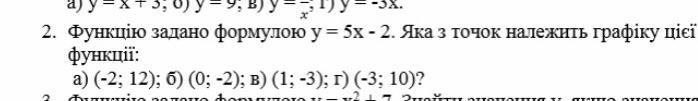 Функцію задано формулою у = 5х - 2. Яка з точок належить графіку цієї функції: a) (-2; 12); б) (0; -2); в) (1; -3); г) (-3; 10)?