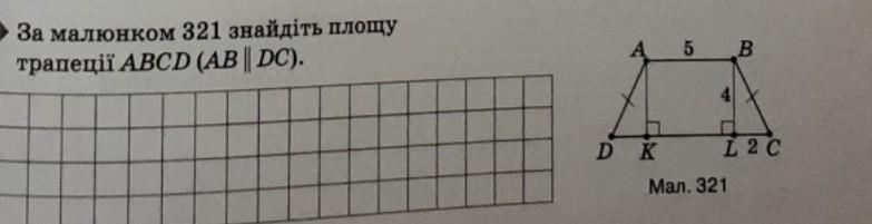 1) △AKD=△BLC (за катетом і гіпотенузою: AD=BC - як бічні сторони рівнобічної трапеції, BL=AK -як її висоти). Тому DK=LC=2 (ед)