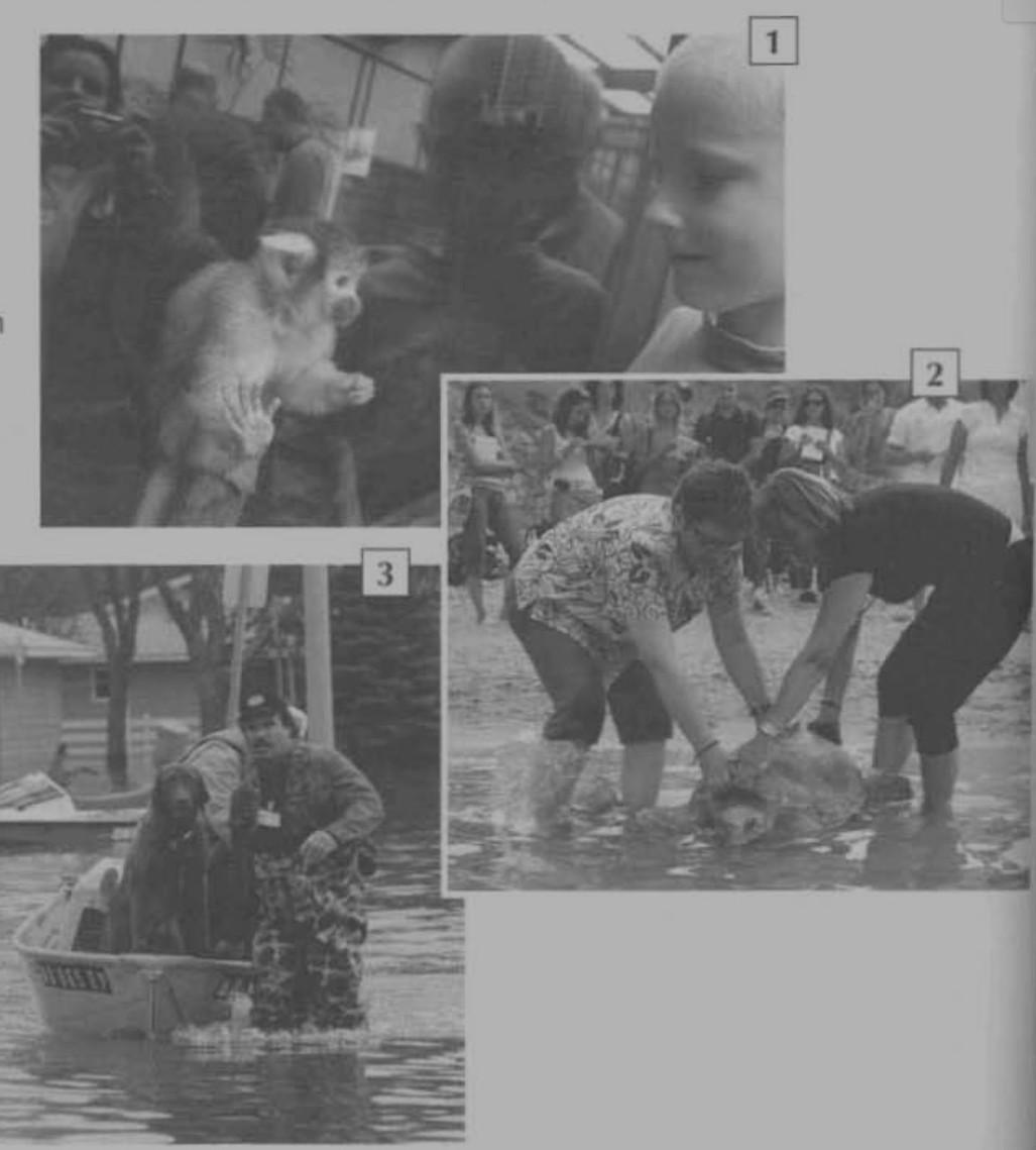 In the third picture 1 ..... is a flood in a street. In the 2.... of the picture there is a large dog 3..... is sitting in a small boat. Next to the boat, on the 4.... there is a man 5....is walking in the water and pulling the boat. In the 6.... we can see some houses and another small boat
