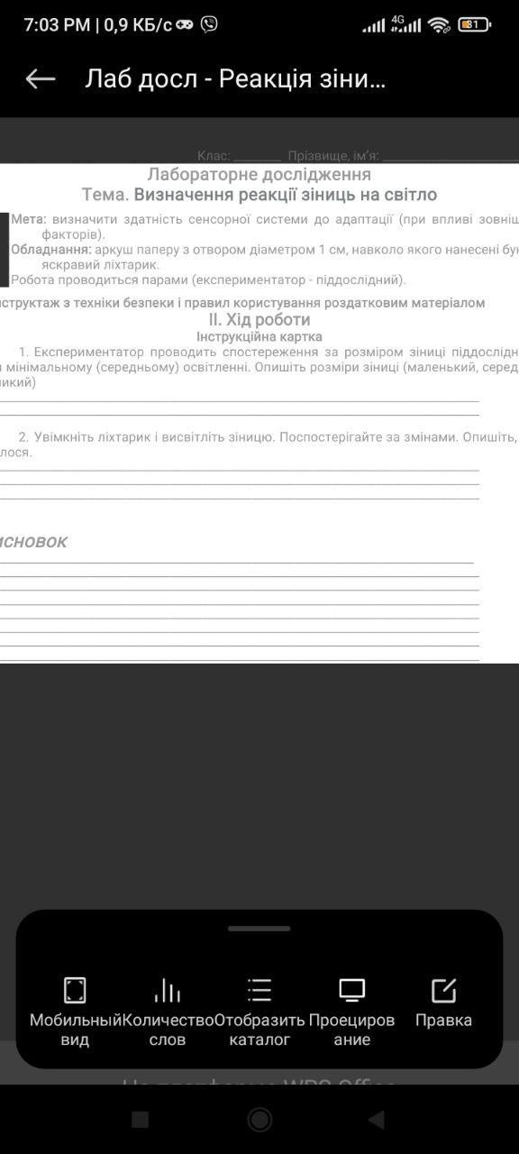 Висновок: Залежно від освітленості розміри зіниці змінюються: вона розширюється в темряві, при больових відчуттях, рефлекторно зменшується при яскравому світлі