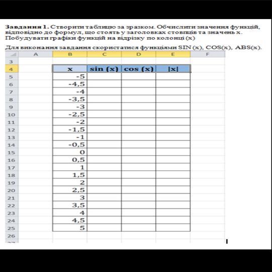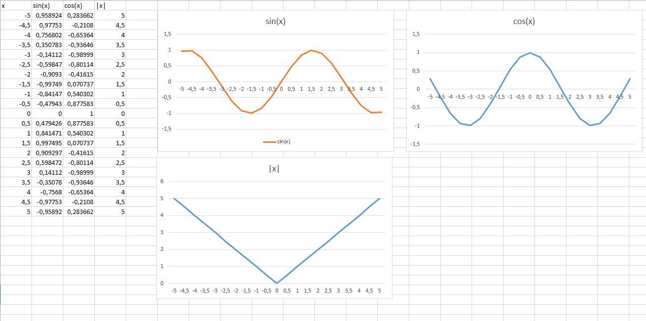 Создать таблицу по образцу. Вычислить значение функций в соответствии с формулами, стоящими в заголовках столбцов и значений х. Построить графики функций на отрезке по колонке (х) Для выполнения задачи воспользоваться функциями SIN(x), COS(x), ABS(x).