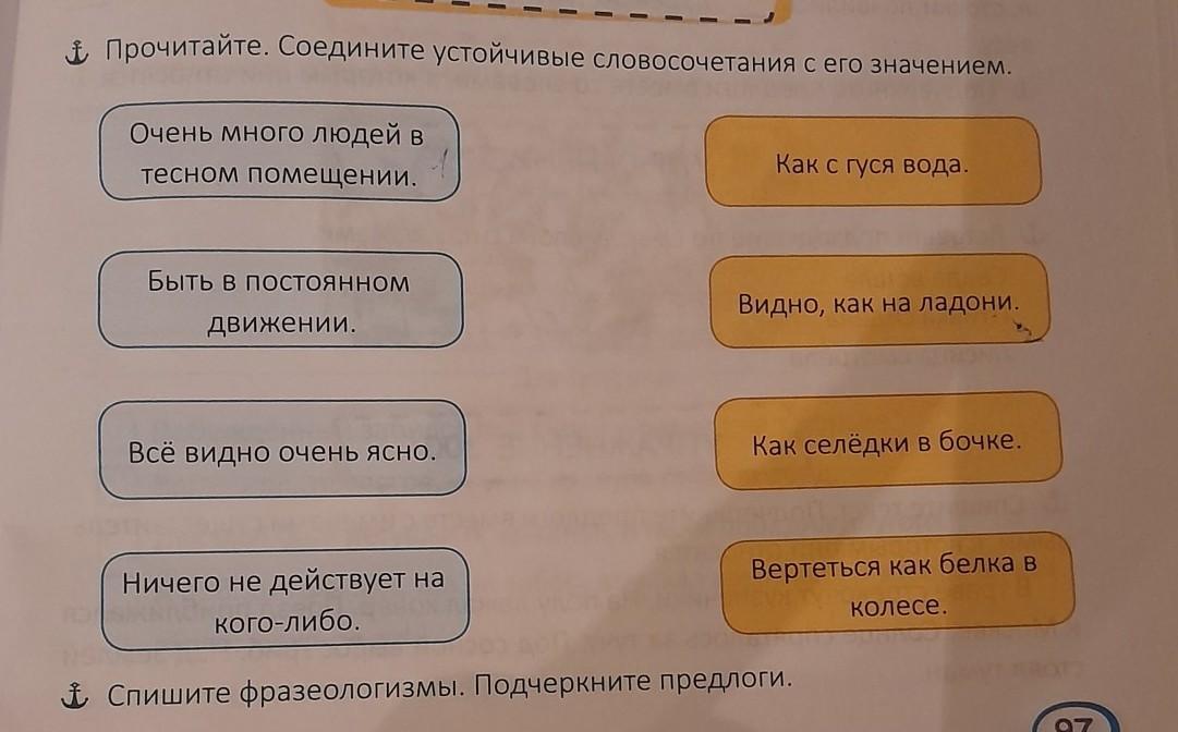 Прочитайте. Соедините устойчивые словосочетания с его значением. Спишите фразеологизмы. Подчеркните предлоги.