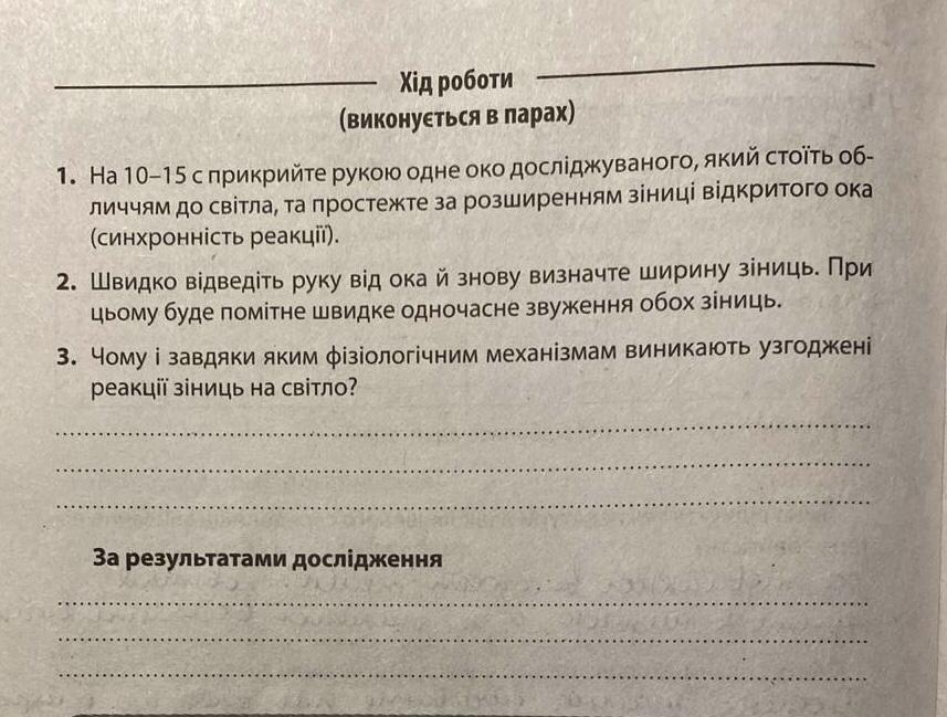 1. На 10-15 с прикрийте рукою одне око досліджуваного, який стоїть обличчям до світла, та простежте за розширенням зіниці відкритого ока (синхронність реакції).