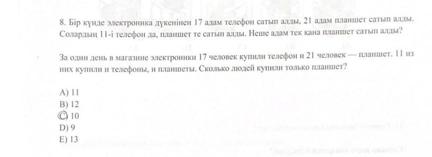 Бiр кунде электроника дукенiнен 17 адам телефон сатып алды, 21 адам планшет сатып алды. Солардын 11-i телефон да, планшет те сатып алды. Неше адам тек кана планшет сатып алды? Пж помагитее