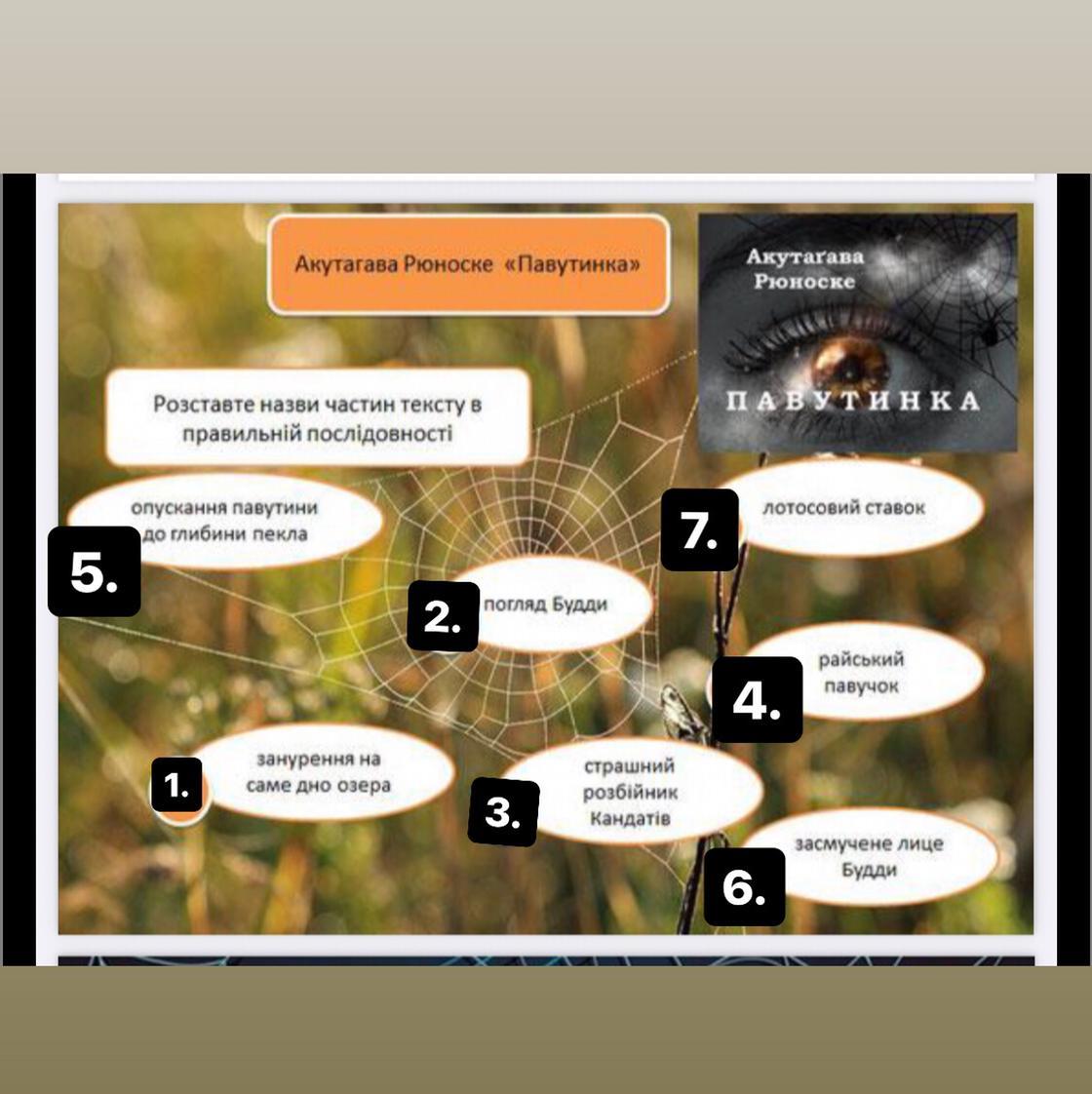 1.Відтворити послідовність подій у новелі «Павутинка» ( на фото )