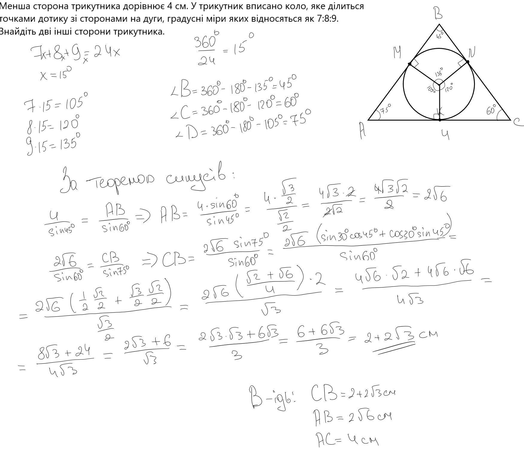 Менша сторона трикутника дорівнює 4 см. У трикутник вписано коло, яке ділиться точками дотику зі сторонами на дуги, градусні міри яких відносяться як 7:8:9. Знайдіть дві інші сторони трикутника