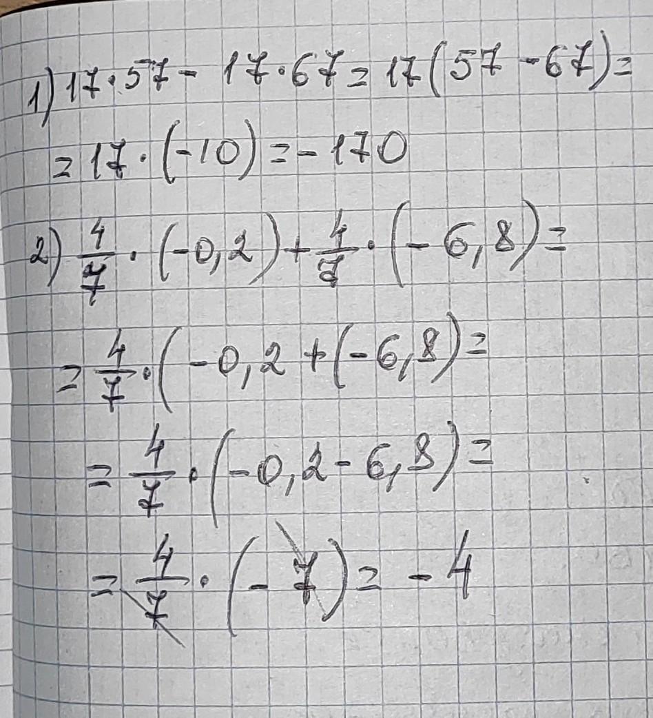 2) 4/7×(-0,2)+4/7×(-6,8)=4/7×(-0,2+(-6,8))=