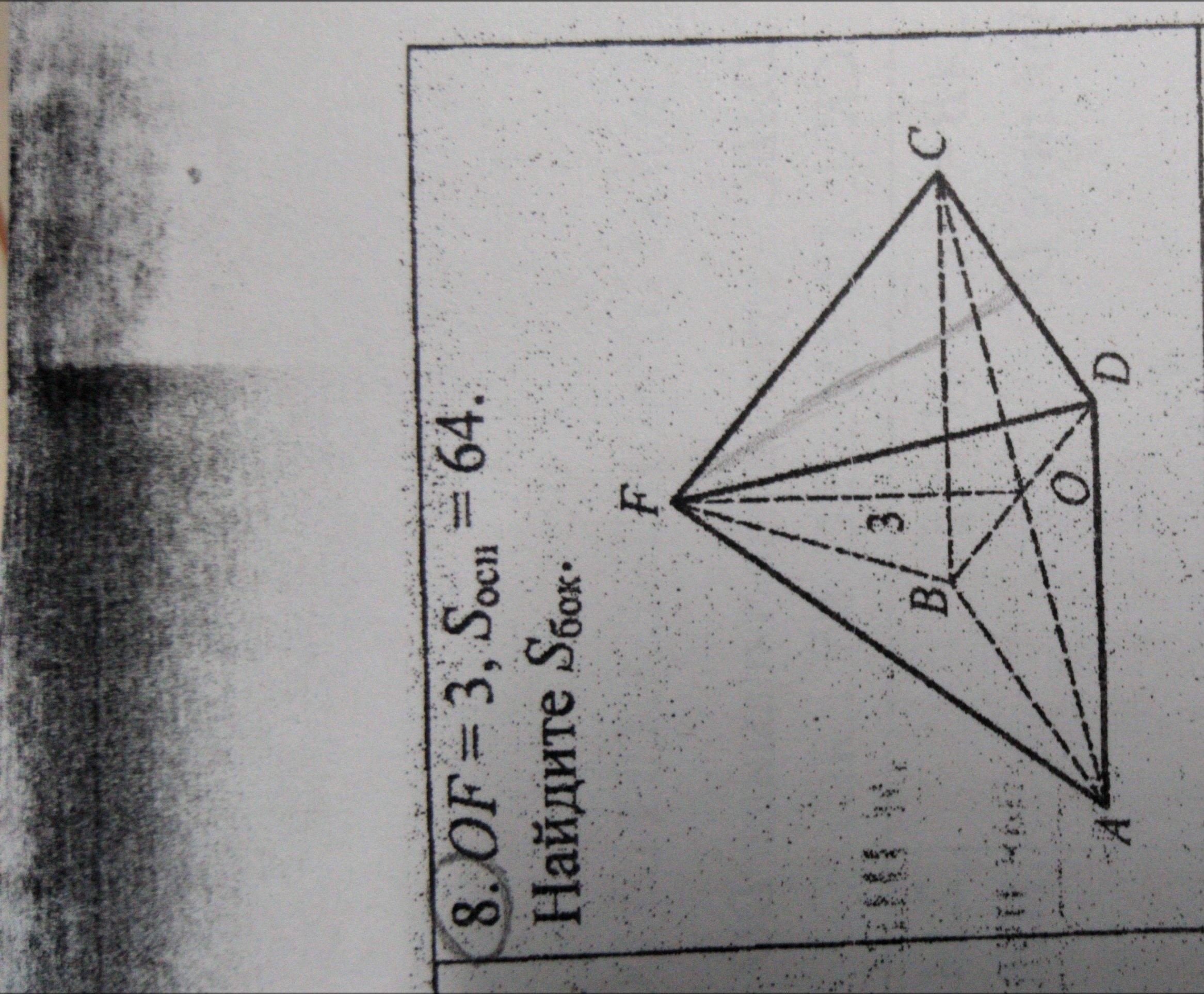 Знайдемо апофему. Це перпендикуляр проведений з вершини F на сторону DC. Точку дотику з DC назвемо, наприклад, точкою М. Утвориться прямокутний трикутник FOM (Кут О=90°). OF за умовою дорівнює 3 см, а ОМ= AD/2=8/2=4 см.