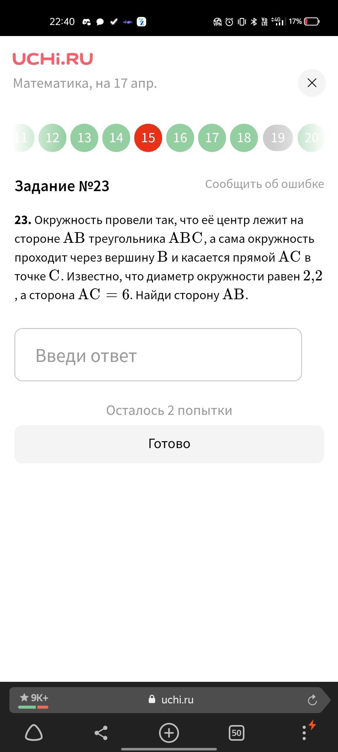 Окружность провели так, что её центр лежит на стороне AB треугольника ABC , а сама окружность проходит через вершину B и касается прямой AC в точке C . Известно, что диаметр окружности равен 2,2 , а сторона AC = 6. Найди сторону AB .